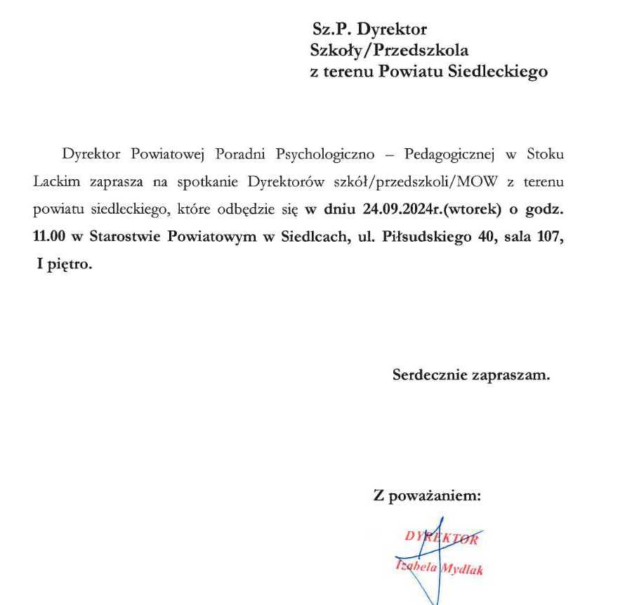 24 września 2024 r. w Starostwie Powiatowym w Siedlcach odbyło się coroczne spotkanie przedstawicieli Powiatowej Poradni Psychologiczno – Pedagogicznej w Stoku Lackim z dyrektorami szkół, przedszkoli, placówek oświatowych, opiekuńczo – wychowawczych z terenu powiatu siedleckiego. W spotkaniu wzięła udział Wicestarosta Siedlecki – Pani Małgorzata Cepek; Przewodniczący Komisji Oświaty, Kultury, Sportu, Zdrowia i Pomocy Społecznej – Pan Mirosław Bieniek; Kierownik Referatu ds. Oświaty i Zdrowia – Pan Tomasz Płatkowski. Natomiast z ramienia Kuratorium uczestniczyła Pani Ewa Dombrowska – starszy wizytator.